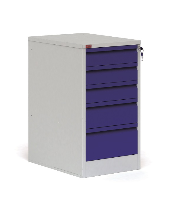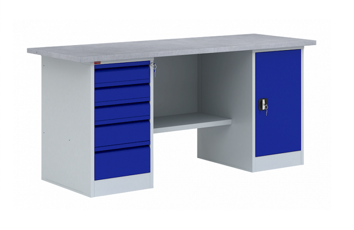 Металлические слесарный верстак ВП-4Т представляет собой рабочий стол для ручной обработки металлических, деревянных изделий, а также предметов, выполненных из других материалов. Металлический верстак используется в мастерских, гаражах, автосервисах и в других рабочих зонах. Он являются основой, как небольшого промышленного производства, так и крупного предприятия. Допустимая равномерно распределенная нагрузка на верстак - 1000 кг, на полку верстачную - 40 кг, на выдвижной ящик и полку тумбы Т-1 - 30 кг. В комплект верстака ВП-4Т входит: столешница СТ-3 из МДФ, покрытая оцинкованным листовым металлом, стенка задняя металлическая, тумба Т-2 с пятью выдвижными ящиками на телескопических направляющих, тумба Т-1 с двумя съемными полками. Тумбы закрываются ключевым замком. Дополнительно на верстак можно установить перфорированный экран соответствующего размера, аксессуары на экран. Цвет: верстак - серый Ral 7035, дверь тумбы - синий Ral 5002